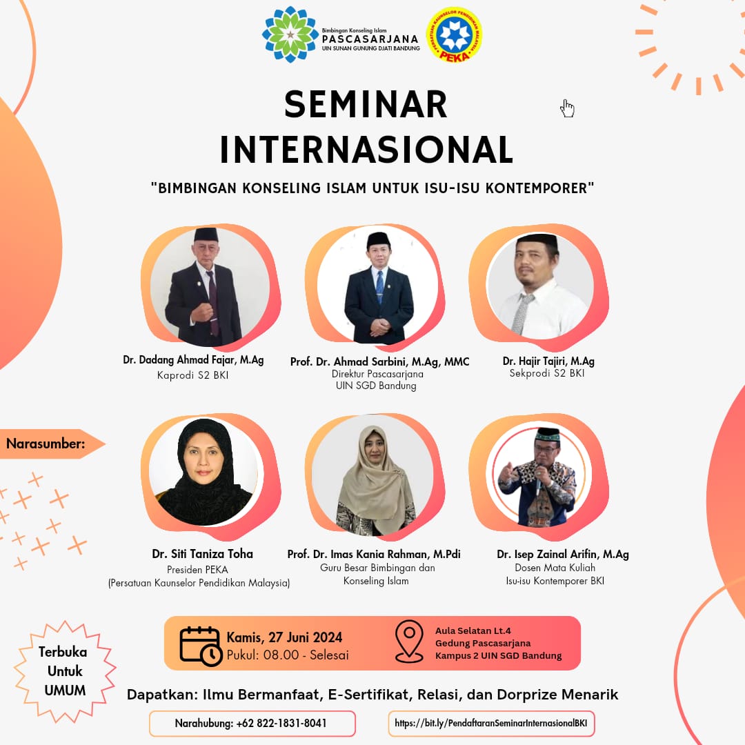 Seminar ini bertujuan untuk meningkatkan pengetahuan, wawasan dan spirit yang selalu menyala dalam mengembangkan bimbingan dan konseling Islam. Selain itu juga untuk mengembangkan kepekaan dan kesadaran terhadap realitas yang terus berkembang yang penting direspon oleh para akademisi, ilmuan dan praktisi BKI.
