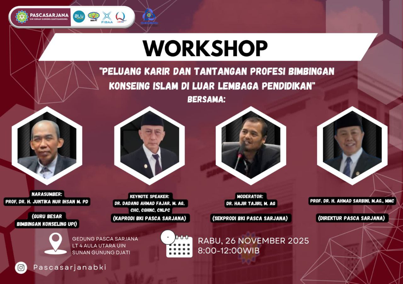 Bandung – Pascasarjana UIN Sunan Gunung Djati Bandung kembali menyelenggarakan kegiatan akademik strategis melalui Workshop bertema “Peluang Karir dan Tantangan Profesi Bimbingan Konseling Islam di Luar Lembaga Pendidikan.” Acara digelar pada Rabu (26/11/2025) di Aula Utara Gedung Pascasarjana lantai 4 dan diikuti oleh mahasiswa Magister BKI serta sivitas akademika Pascasarjana UIN Bandung.